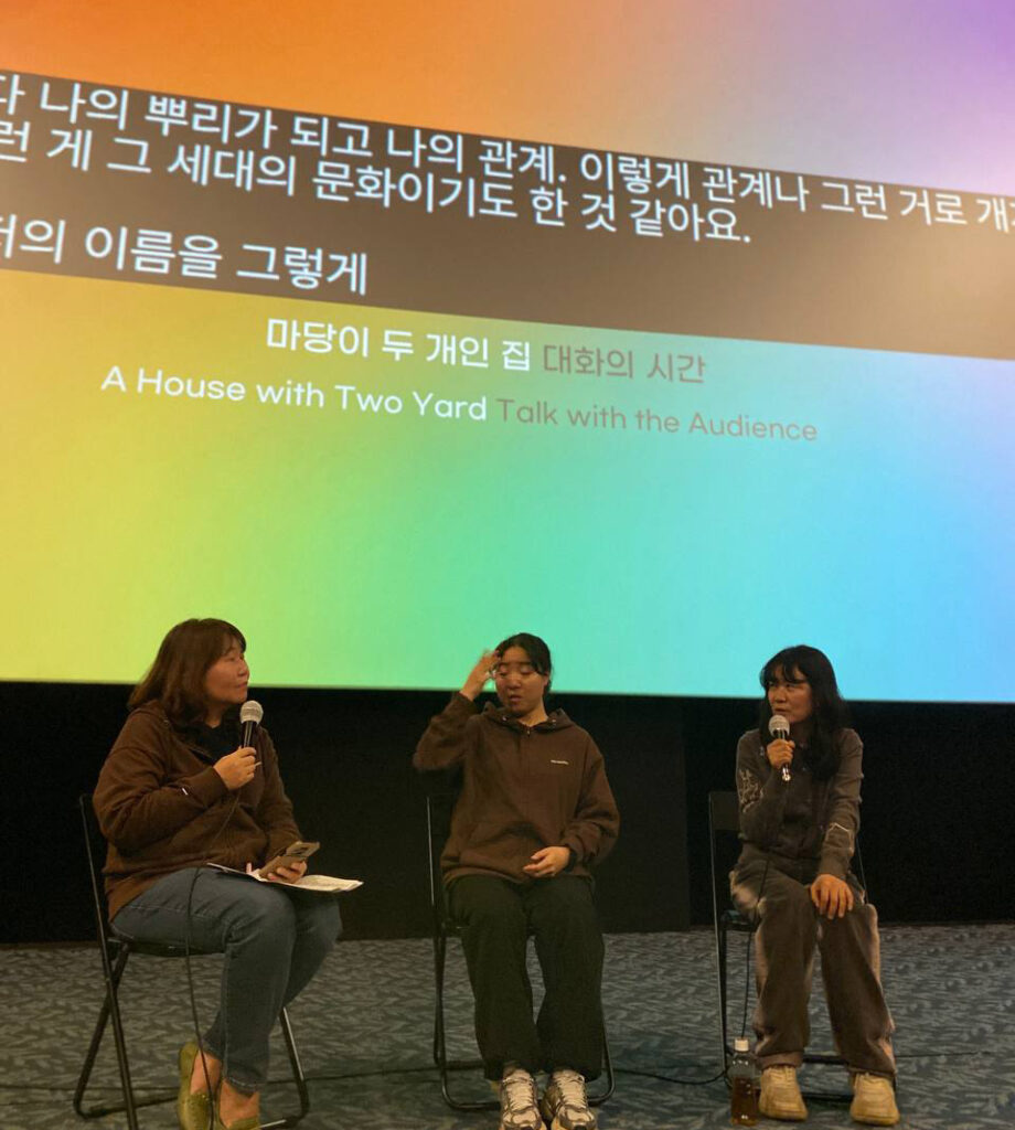 <마당이 두 개인 집> 상영 후, 설수안 감독과 함께 한 노년 여성의 살림 노동이 담긴 시간과 감독의 자기 몸에 대한 경험을 통해 세대가 다른 두 여성의 삶의 결이 하나의 여성사적 이야기로 어떻게 이어지며, 그 속에서 사라져 가는 것들에 대한 기억과 기록이 현재를 살아가고 있는 우리의 삶에 어떤 의미를 갖게 되는지 이야기하는 시간을 가졌습니다.