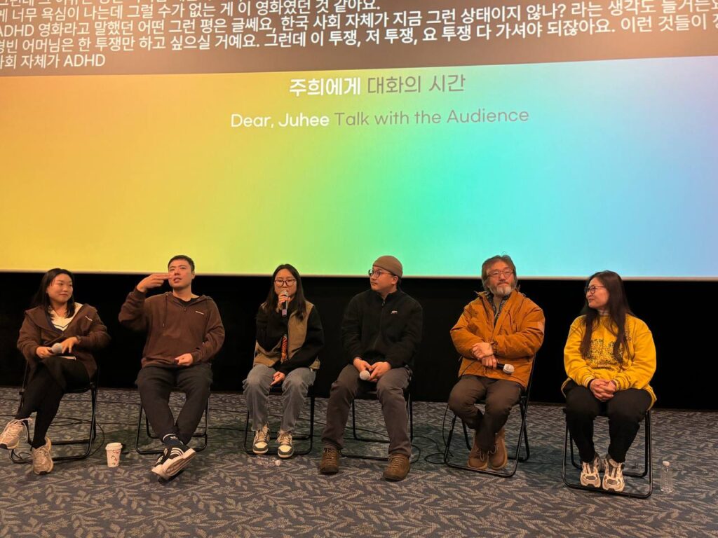 <주희에게> 상영 후 장예정 차별금지법제정연대 공동집행위원장과 전인숙 임경빈 어머니, 장주희, 부성필, 김성환 감독 네 분의 대화손님이 함께 관객과 대화하는 시간을 보냈습니다. 서로 다른 투쟁의 삶이 포개어지는 모습을 보여주는 <주희에게>에 출연한 게스트들 은 서로 만나는 과정에 대해서 이야기를 나눴습니다. 암투병과 가정폭력, 4.3, 4.16세월호참사, 장애. 저마다 다른 삶, 다른 투쟁을 하는 사람들이지만 어느 순간 서로 만났습니다. 버킷리스트를 지워가고 참사이후 한번도 계획하지 않은 여행을 가는 시간들은 누군가에게 어렵지 않은 일이지만 누군가에게는 이렇게까지 어려울일인가 의문을 품게 만드는 일들을 해내는 과정은 서로를 확인하는 시간이었습니다.