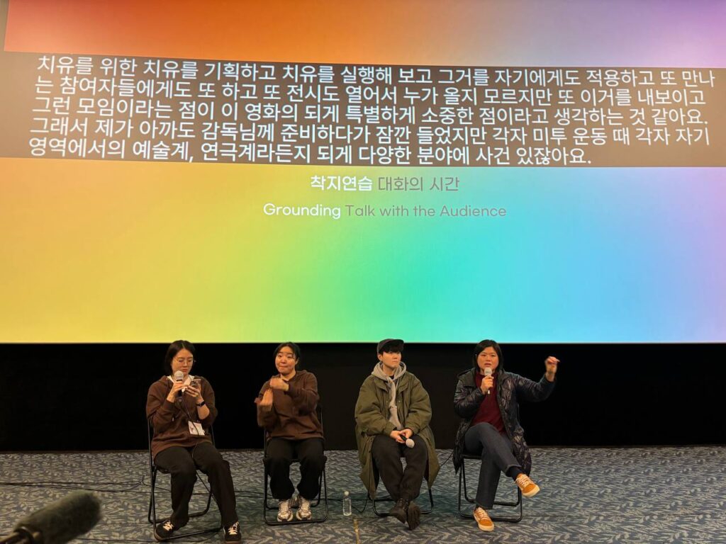 트라우마 이후의 삶을 살아가기 위해 서로에게 발을 딛어보려는 사람들의 이야기가 담긴 <착지연습> 상영 후, 인천인권영화제 희우 활동가의 진행으로 마민지 감독, 한국성폭력상담소 오매 활동가가 함께 대화를 나누었습니다.